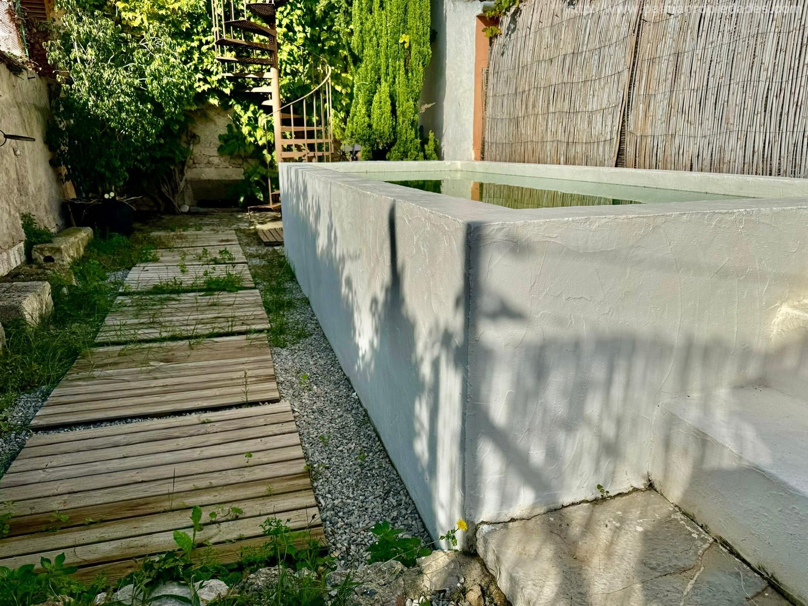 Desde el saón tambien se desciende a la zona de terraza-jardín y a la piscina .